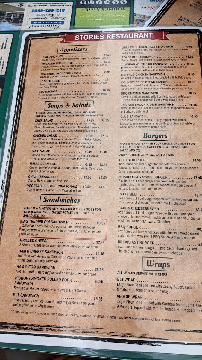 Storie's is known for its exceptional meals, where each dish is crafted with care. Standout items include perfectly fried tenderloin, generous sandwiches like the BLT and Grilled Chicken with Bacon, and the crowd-favorite fried pickles. Customers rave about the mashed potatoes and wholesome pot roast, making every visit feel like a comforting trip home.